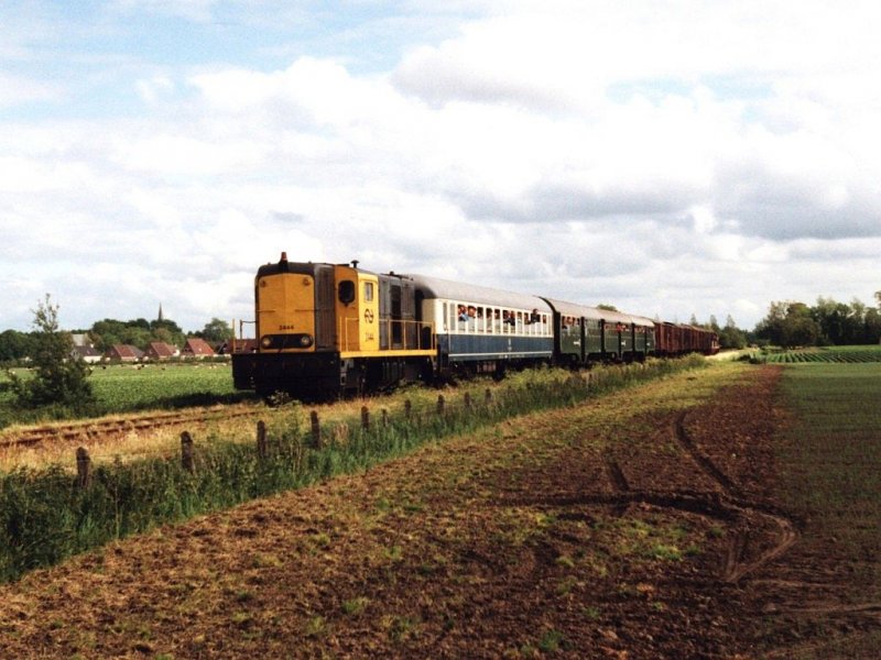 2444 und 2450 + 2413 (Hintergrund) während der Abschiedsfahrt der BR 2400/2500 auf die Güterstrecke Leeuwarden-Stiens bei Stiens am 16-6-1991. Bild und scan: Date Jan de Vries.