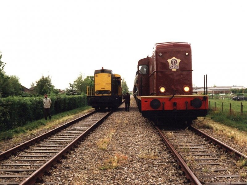 2444 (links) und 2450 während der Abschiedsfahrt der BR 2400/2500 auf die Güterstrecke Leeuwarden-Stiens in Stiens am 16-6-1991. Bild und scan: Date Jan de Vries.