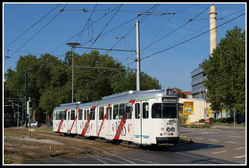 Der Heidelberger Gt8 am Morgen des 7.9.2009 an der Haltestelle Stadtbücherei auf der Linie 21.