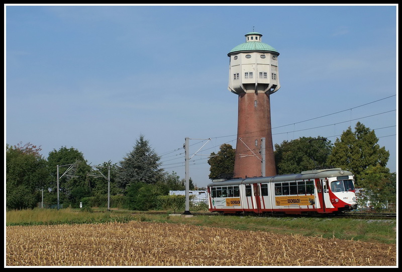 Zwischen Edingen und Heidelberg-Wieblingen ist am 7.9.09 der OEG Tw 110 unterwegs.