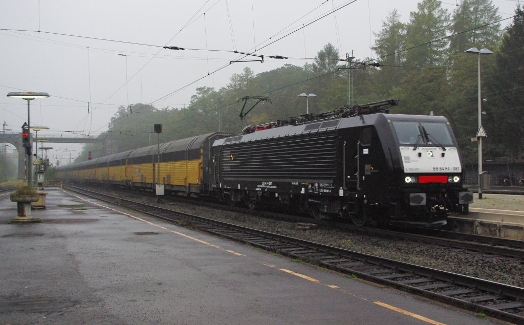 Nicht gerade im besten Fotowetter präsentiert sich 189 997-0 (ES 64 F4-097) auf ihrer Fahrt in Richtung Norden durch Eichenberg. Aufgenommen am 23.10.2009.