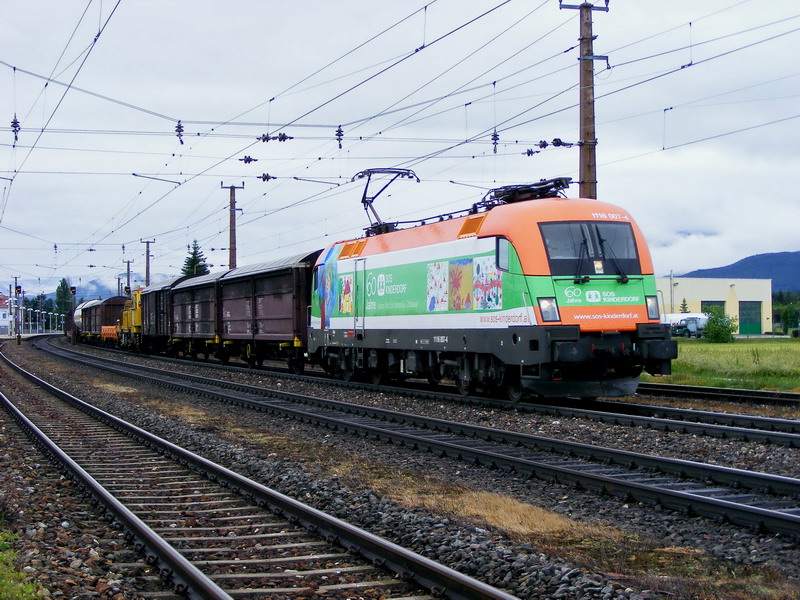 1116.007 "SOS-Kinderdorflok" fährt am 30.05.2009 bei Neunkirchen mit einem Güterzug nach Wien.