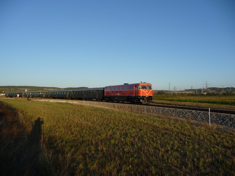 Die 2050.09 fährt mit einem 4-teiligen, tannengrünen Schlierenwagenzug in wenigen Sekunden durch die Bahnhaltestelle Hetzmannsdorf-Würniz. (04.10.2009)