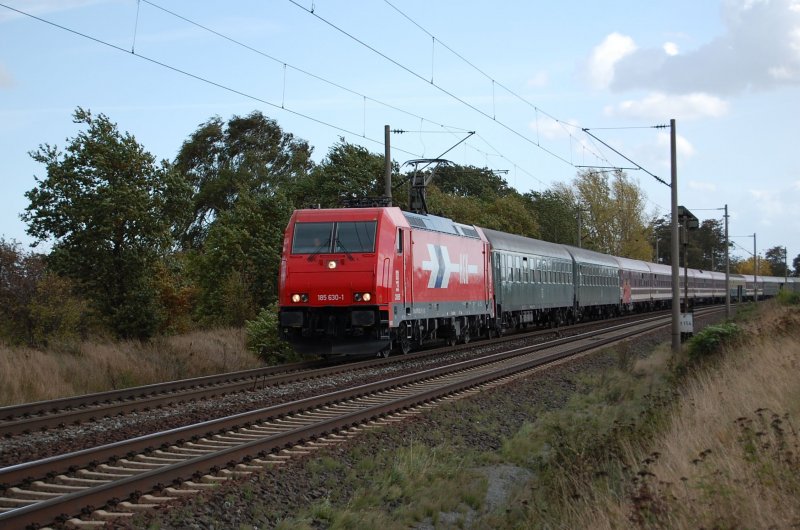 ES 64 P-001 führte diesen Lokzug bei nasskaltem Wetter nach Guben an. Eingereiht sind SNCB 1824 (9188 0018 024-5 BE-SNCB), SNCB 1825 (9188 0018 025-2 BE-SNCB), MRCE ES 64 F4-026 (9180 6189 926-9 D-DISPO), MRCE ES 64 F4-030 (9180 6189 930-1 D-DISPO), MRCE ES 64 F4-454 (9180 6189 454-2 D-DISPO), MRCE ES 64 F4-455 (9180 6189 455-9 D-DISPO), MRCE ES 64 F4-456 (9180 6189 456-7 D-DISPO), HUPAC ES 64 U2-101 (LZB: 182 601-5) und HUPAC ES 64 U2-102 (LZB: 182 602-3) (Berlin Rbf Wuhlheide 04.10.2009)