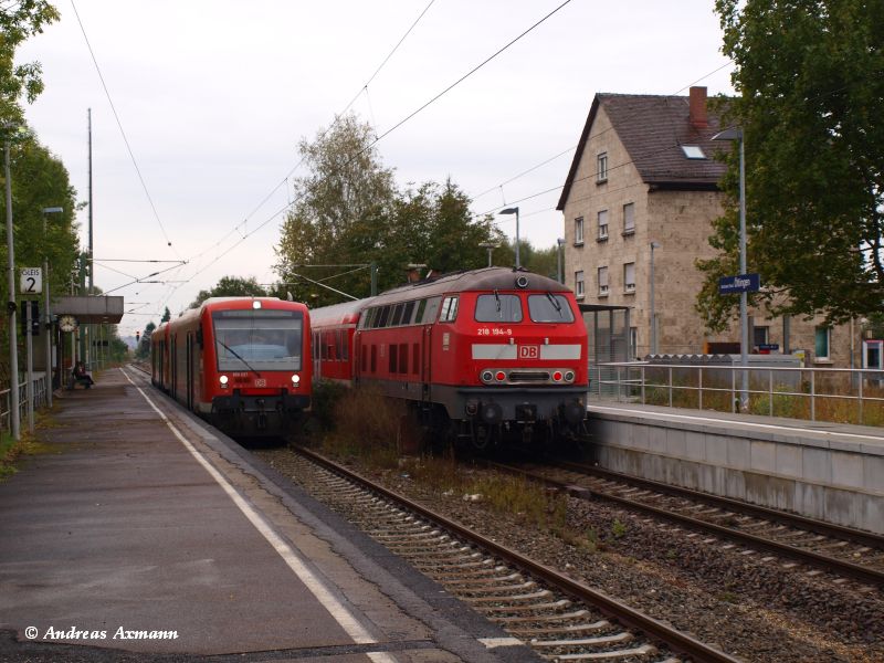 Bei Regnerischem Wetter, hat im Bahnhof Kirchheim unter Teck - Ötlingen RB 13959 mit VT650 027 / 011 aus Wendlingen/N nach Oberlenningen eine Zugkreuzung mit RB 13966 und 218 194, der aus Oberlenningen kommt und nach Wendlingen/N fährt. (05.10.2009)