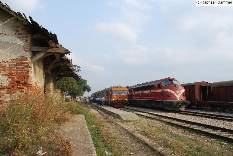 Lok 007 der Kosovo Railways muss mit ihrem Sonderzug am 24.08.09 auf einem kleinen Bahnhof zwischen Fushe Kosove / Kosovo Polje und Kline / Klina warten, bis der Planzug nach Peje / Pec, bestehend aus Triebwagen 03 und 04 seine Fahrgäste aufgenommen hat und natürlich vorrangig weiterfährt. Links im Bild ein im Krieg zerstörter Güterschuppen, rechts zwei lange Reihen alter Güterwägen in kaum besseren Zustand.