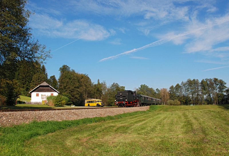 ÖGEG 77.28 hat am 04.10.2009 mit einem Sonderzug Timelkam verlassen und ist Richtung Ampflwang unterwegs.