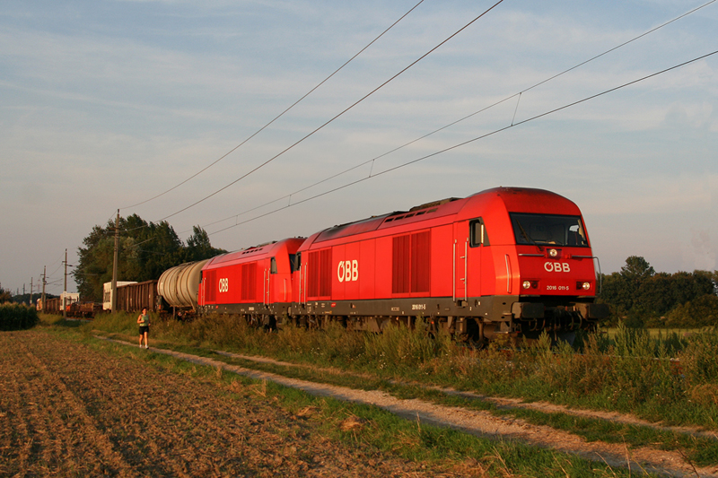 22.8.08 Diesel im Jahr 2008. Darmals kam noch ein 2016 Tandem für den DG 54008 zum Einsatz. Heute hat ihn ebenfalls die Taurus in der Hand/ am Zughaken. Im Abendlich fahren die 2016 011 und 2016 025 mit dem DG 54008 von Kledering nach Spratzern.