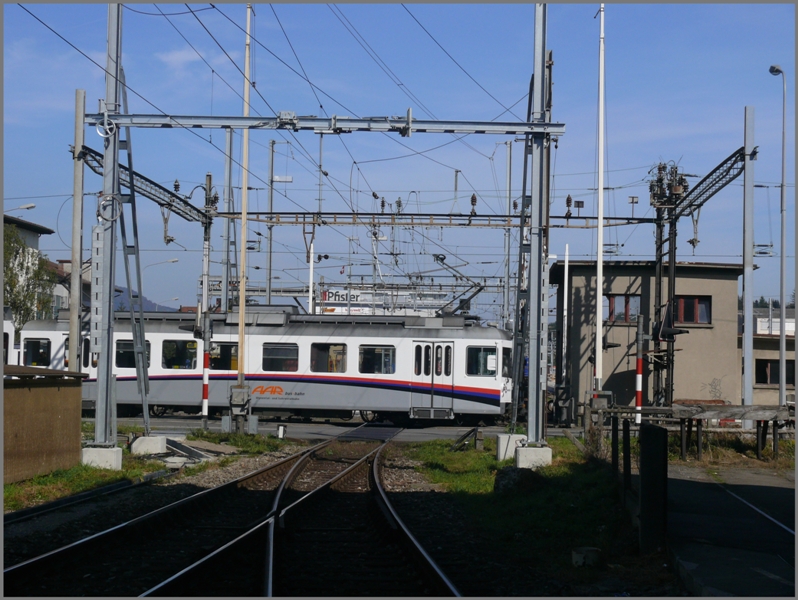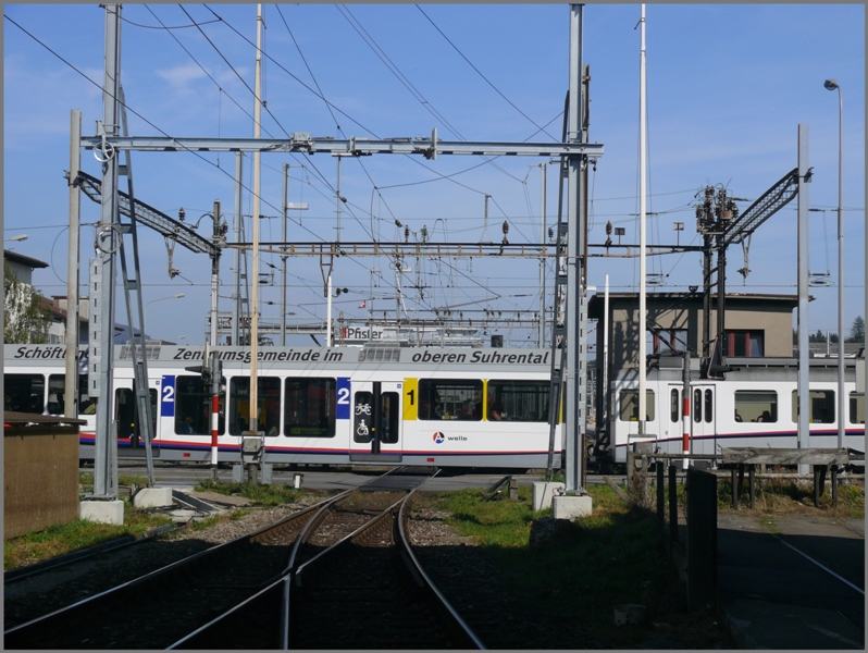 Be 4/4 im neuen Aargauer Welle Look verlässt soeben die SBB Kreuzung, um wenige Meter weiter in Suhr Ausweiche einen Halt einzulegen. Neu verläuft die Linie rechts hinter dem alten Stellwerk an einen gemeinsamen Bahnsteig mit der SBB und unterquert die SBB Linie nach Lenzburg anschliessend Richtung Aarau. Dort wird dann neu das ehemalige SBB Trassee benützt. (03.10.2009)