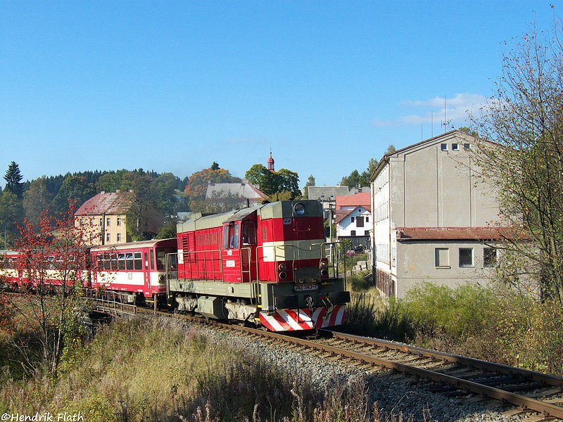 Der Planzug aus Johanngeorgenstadt verlässt am 26.09.2009 den Bahnhof von Horny Blatna (ehem. Bergstadt Platten) in Richtung Karlsbad. Zuglok des "Brotbüchsenzuges" ist die bereits aus Johanngeorgenstadt bekannte 742 343.