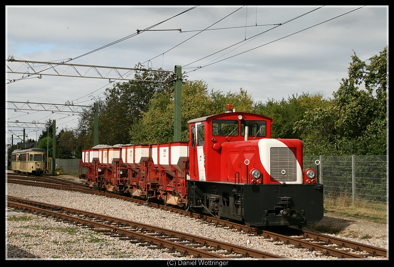 Die DieLo mit den Schotterwagen (Bj. 1925!) im Betriebshof Edingen. Legal fotografiert.