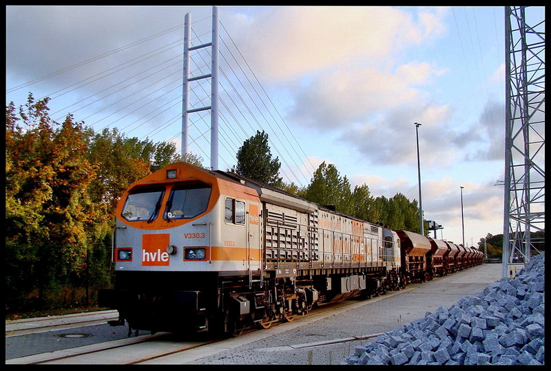 8 Uhr in Stralsund. V330.3 wartet mit Steinsplitt im Südhafen.    am 09.10.09