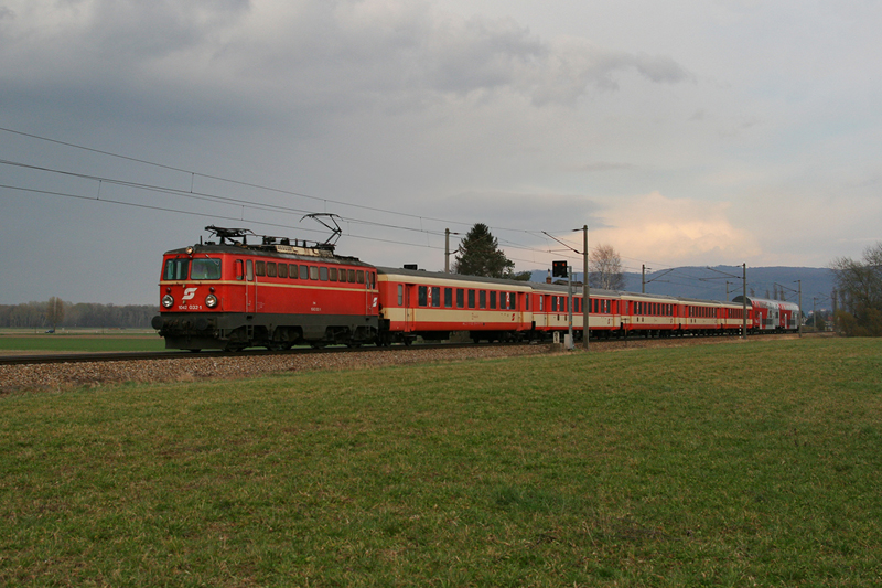 19.3.08 Im letzten Jahr war die FJB noch eine Abwechslungsreiche Strecke, mittlerweile gibt es weder Schlieren noch planmäßige 1042 Leistungen. Deswegen hier ein Bild vom Vorjahr mit der 1042 032 am REX 7124 "Kremser Bote" von Wien FJB nach Krems an der Donau.