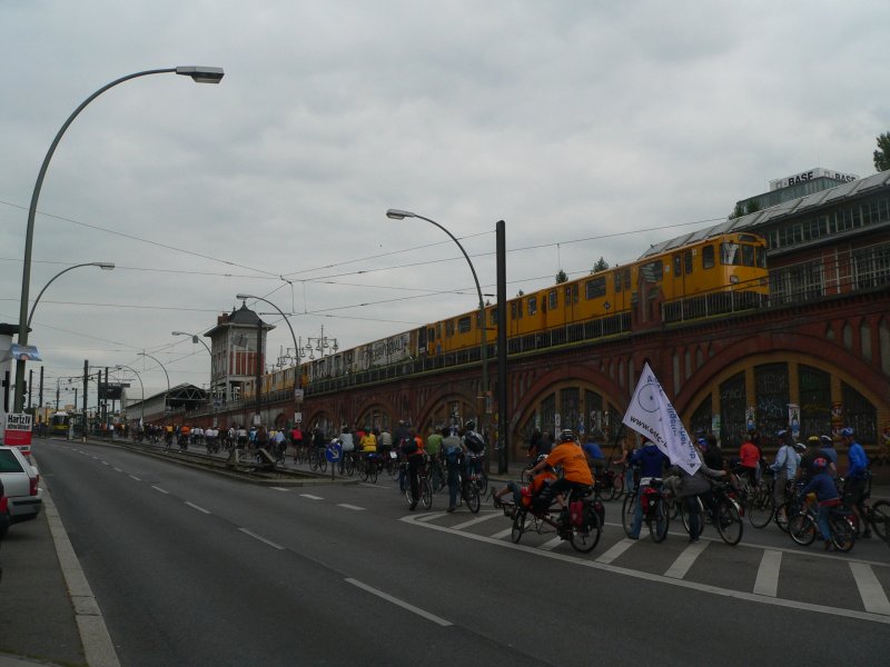 CO2-arm (U-Bahn) und CO2-frei (Fahrrad). Die Politik hats noch nicht mitbekommen und träumt stattdessen vom Elektroauto. 26.9.2009, Warschauer Straße, Fahrradkreisfahrt Berlin