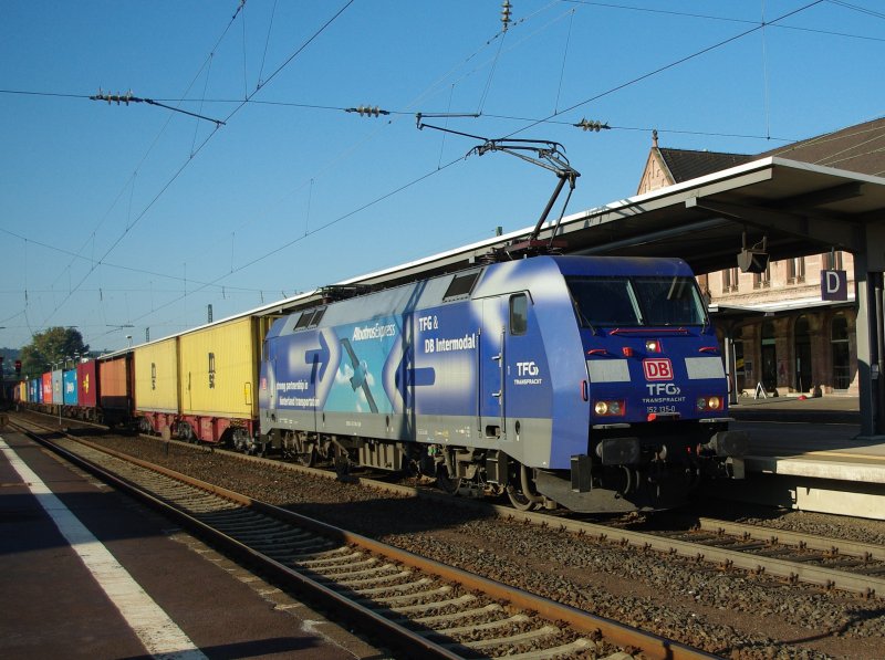 Gerade auf dem Bahnseig des Bahnhofs Bad Hersfeld angekommen, kam auch schon 152 135-0 mit einem Containerzug in Fahrtrichtung Norden vorbei. Aufgenommen am 01.09.2009.