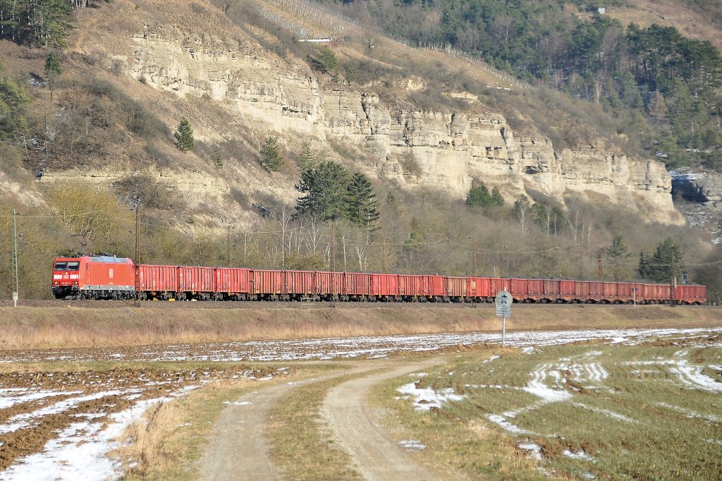 185 356 mit ihrem Ölzug hat gerade den Haltepunkt Helmsheim passiert und fährt weiter richtung Stuttgart. Aufgenommen am 09.04.10