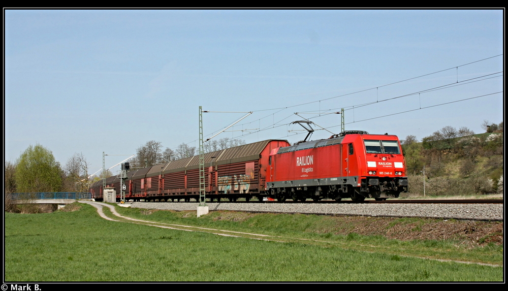 185 246 mit ihrem leeren Autozug bei Helmsheim. Aufgenommen am 09.04.10