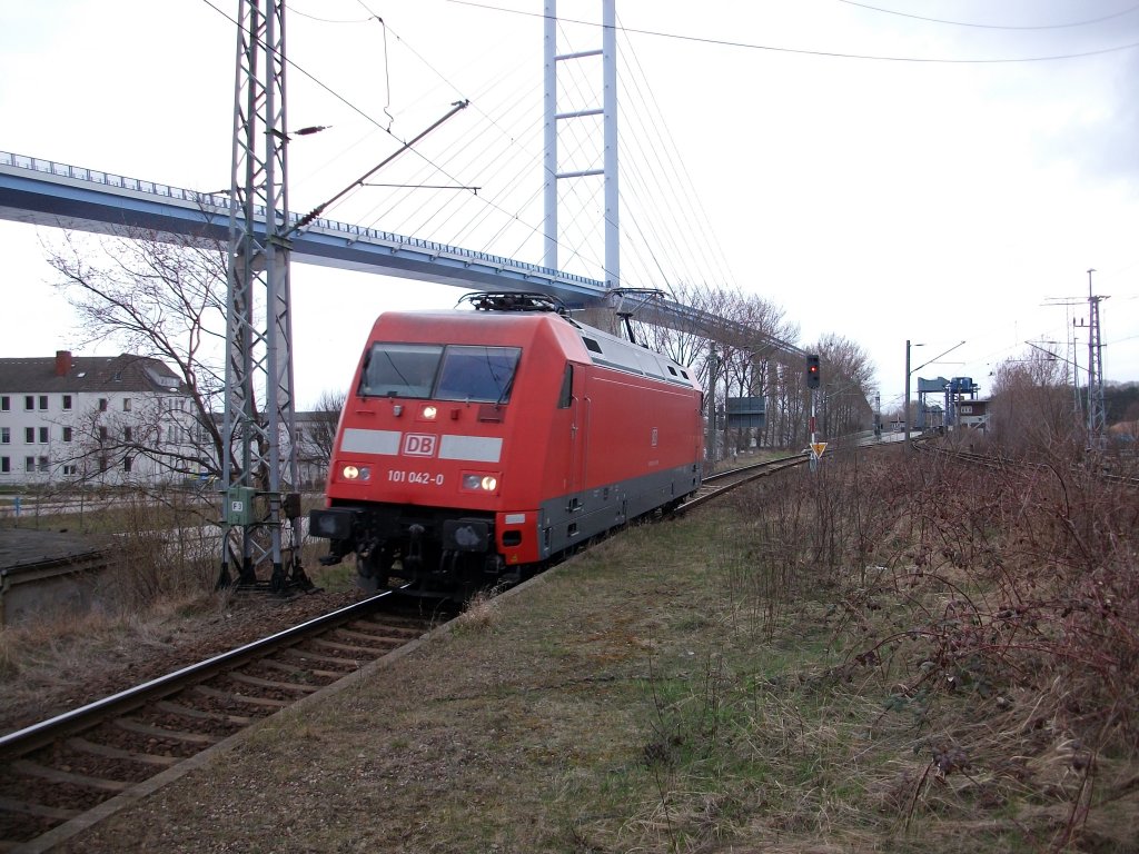 Erst brachte 101 042 am 09.April 2010 den IC 2212 aus Koblenz bis nach Binz.Ein paar Stunden später kam Sie als Lz von Binz nach Stralsund durch den Bahnhof Stralsund Rügendamm gefahren.