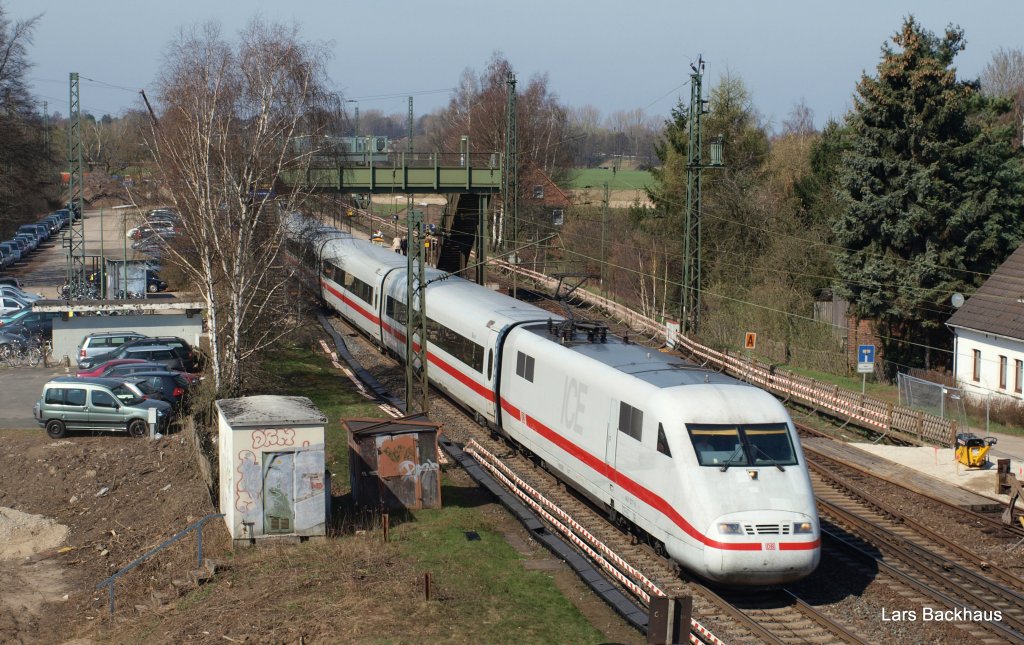 ICE 77 Hamburg-Altona - Zürich HB eilt am 07.04.10 durch Ashausen Richtung Hannover Hbf. Dank des Dreigleisigen Ausbaus zwischen Stelle und Lüneburg, sind durch Vegetationsfreischnitte einige interessante, neue Fotostellen entstanden, wie diese. Jedoch werden mit der Zeit auch viele bekannte Fotostellen durch Lärmschutzwände verbaut sein.