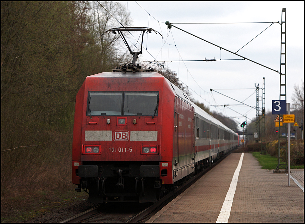 101 018 (9180 6101 018-0 D-DB) und 101 011 (am Zugschluss) durchfahren mit dem IC 2116, Stuttgart Hbf - Stralsund, den Bahnhof von Capelle(Westf). (10.04.2010)