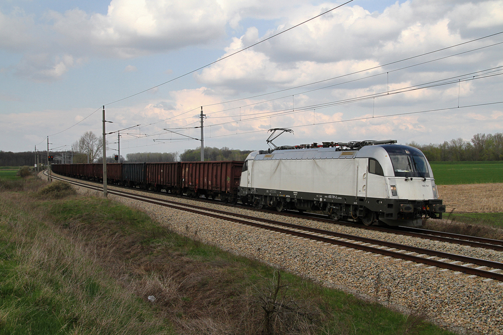 10.4.10 Derzeit verkehrt die Vorführlok des Siemens Konzerns (unter der Nummer 183 701) für das Unternehmen CargoServ. Durch die Umleitung der CargoServ Züge von der Summerauerbahn über den Grenzübergang Breclav ergeben sich somit neue Fotoobjekte. Hier bespannt die 183 701 den SGAG 46181 von Breclav nach Linz Stahlwerke bei Dürnkrut.