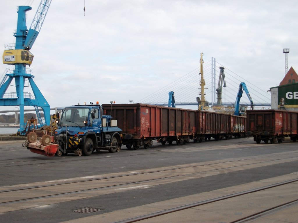 Im Stralsunder Nordhafen rangierte am 09.April 2010 dieses Zweiwegefahrzeug.