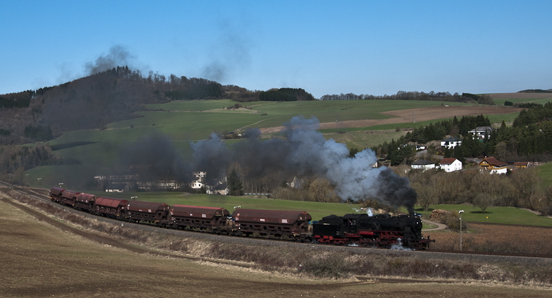 Schon von weitem war 330091 ein Klangerlebnis als er aus Norden bergauf kommend durch Eichenberg brummte. Am Haken 27 voll beladene H-Wagen Aufgenommen am 07.04.2010.