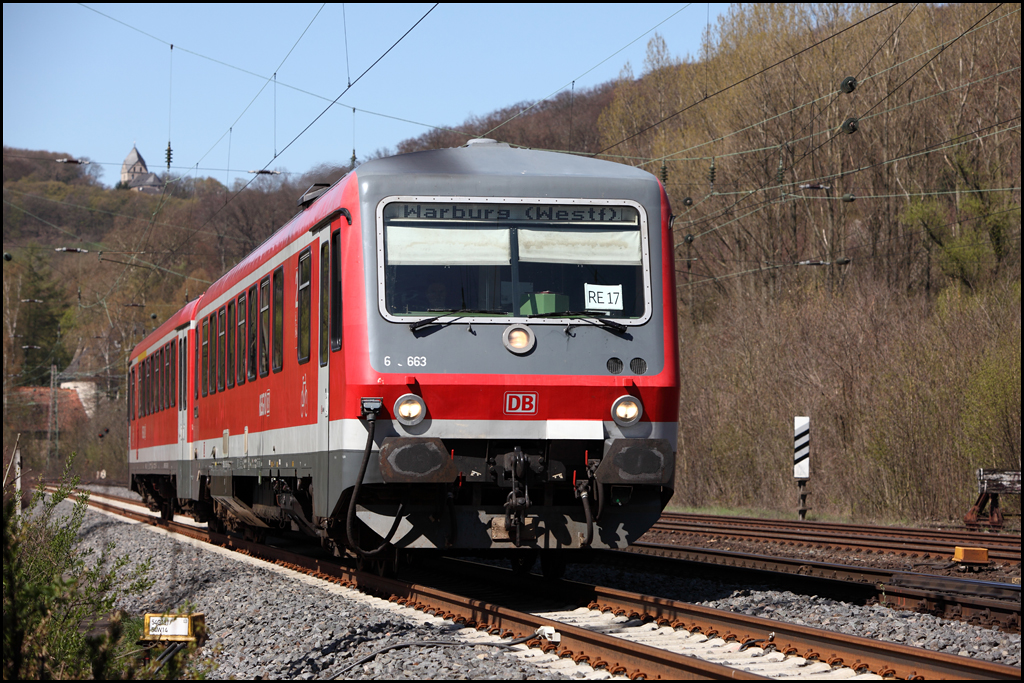 628/928 663 ist als RE17 (RE 20209) "SAUERLAND-Express", Hagen Hbf - Warburg(Westf), bei Westhofen unterwegs. (17.04.2010)