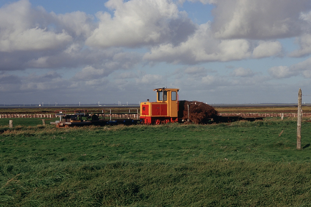 Aus dem Dia-Archiv: Halligbahn Lüttmoorsiel - Nordstrandischmoor / Lore 1 schiebt schiebt ihren Zug die Auffahrt zur Spitzkehre auf dem Deich am Lüttmoorsiel hinauf. (15.09.2006)