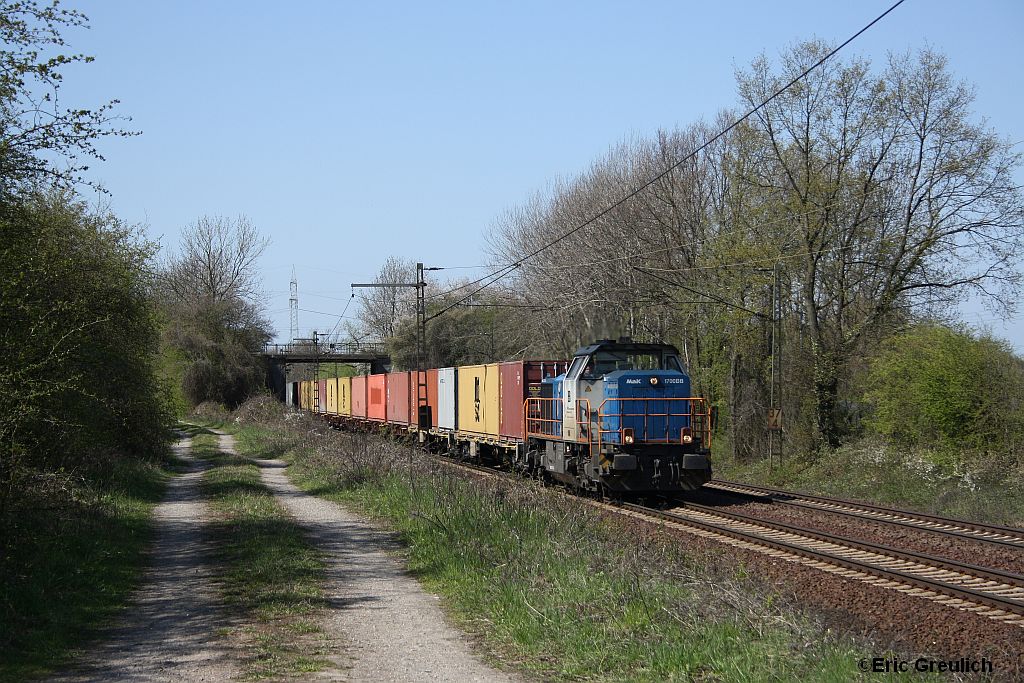 MaK G 1600 BB 120076 der OHE kommt am 17.04.10 mit einem Containerzug aus Hamburg-Waltershof und zieht diesen nun in den Rbf Alte-Süderelbe.