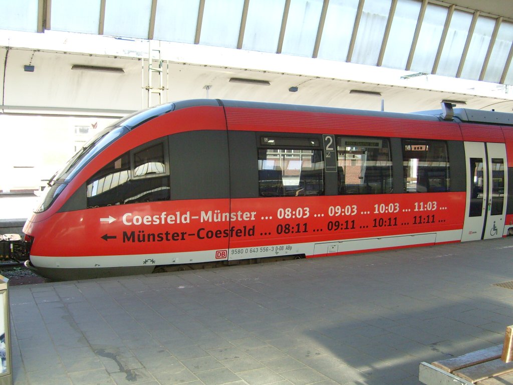 Hier ein Talent am 17.4. in Münster(westf) der in kürze nach Enschede fahren soll. Damit sich die Fahrgäste den Fahrplan und wahrscheinlich auch das Zugpersonal besser merken können hat die Bahn ihn kurzerhand aussen an das Fahrzeug angeschrieben.