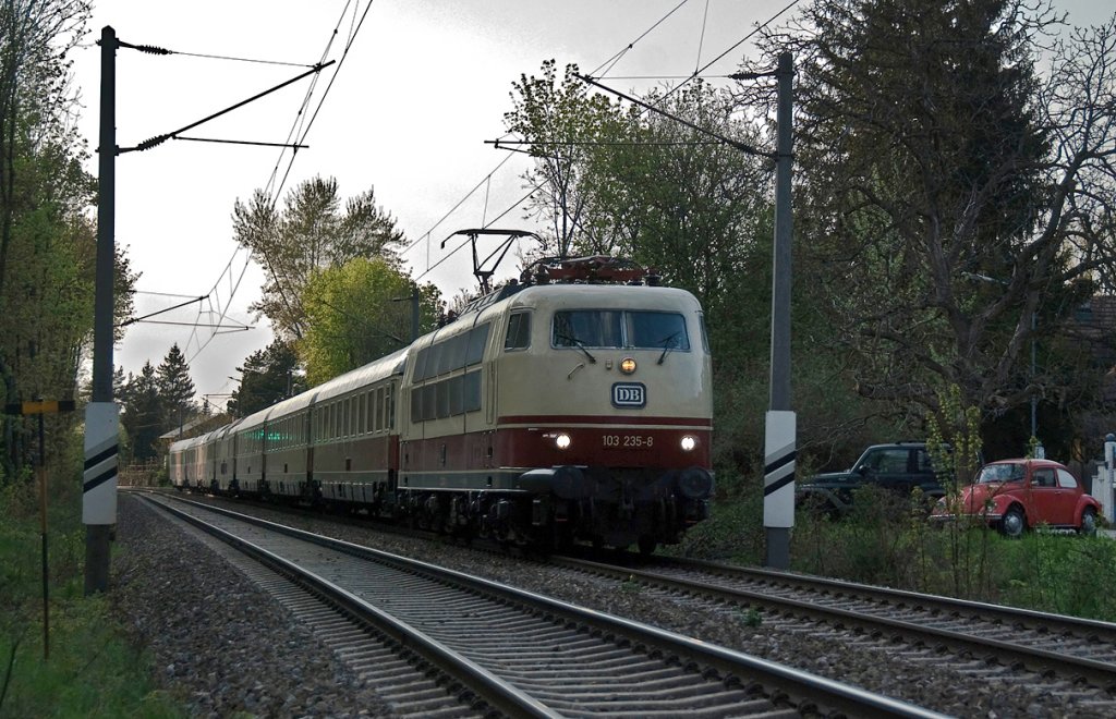 D 16151 (Dortmund - Wien FJB) kurz vor Kritzendorf, am 21.04.2010 in Höflein an der Donau. Die Lok und der rote VW Käfer passen doch irgendwie in die gleiche Epoche;-)