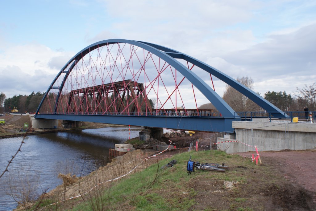 Die neue Eisenbahnrücke über den Mittellandkanal in Haldensleben.Zu diesen Zeitpunkt war sie noch nicht für den Bahnverkehr zwischen Haldensleben und Oebisfelde freigegeben.Die alte Brücke steht zu diesem Zeitpunkt noch,die Gleise waren aber schon zurück gebaut wurden.04.04.2010
