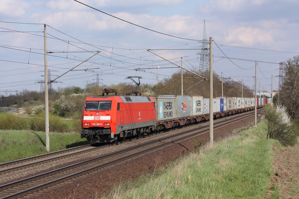 152 160-8 fährt mit einem Containerzug auf der KBS 310 in Richtung Braunschweig. Fotografiert am 22.04.2010 in Magdeburg Diesdorf.