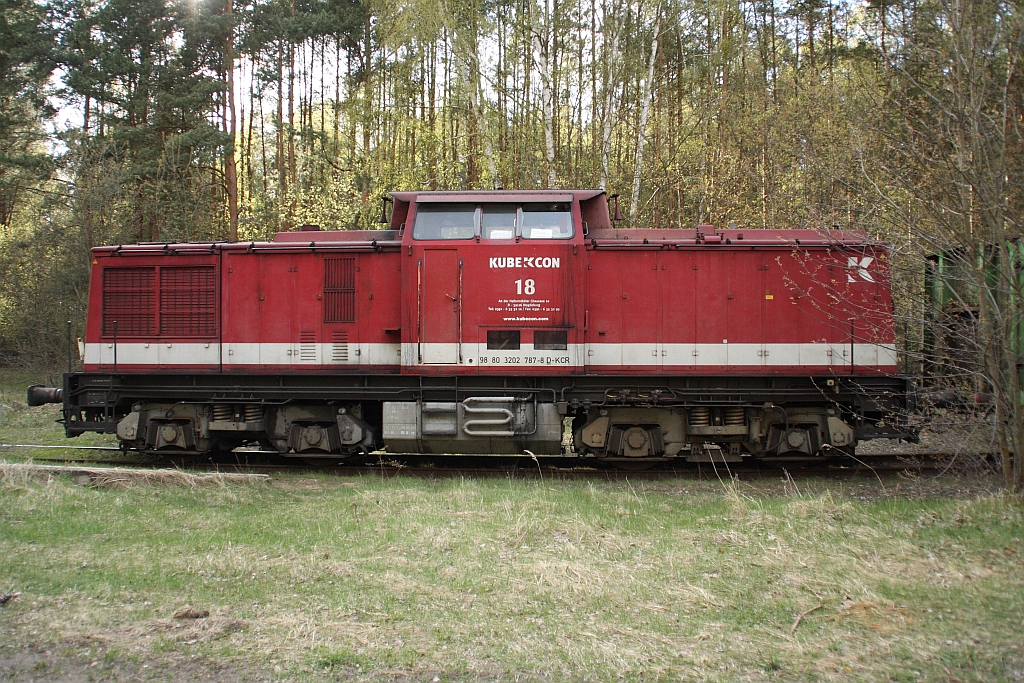 Kube Con 18 (202 787) am Schluß eines Holzzuges auf dem Anschlußgleis des Gewerbeparks Pinnow 22.04.2010
