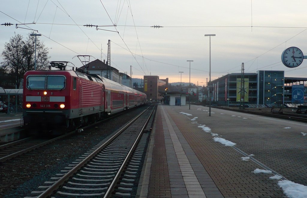 Planmäßig ist die Zuglok 143 315 mit ihrer Neckar-Alb-Bahn am 4.02.10 in den Reutlinger Hbf eingefahren, um in baldiger Kürze die Weiterfahrt in Richtung Metzingen antreten zu können.
