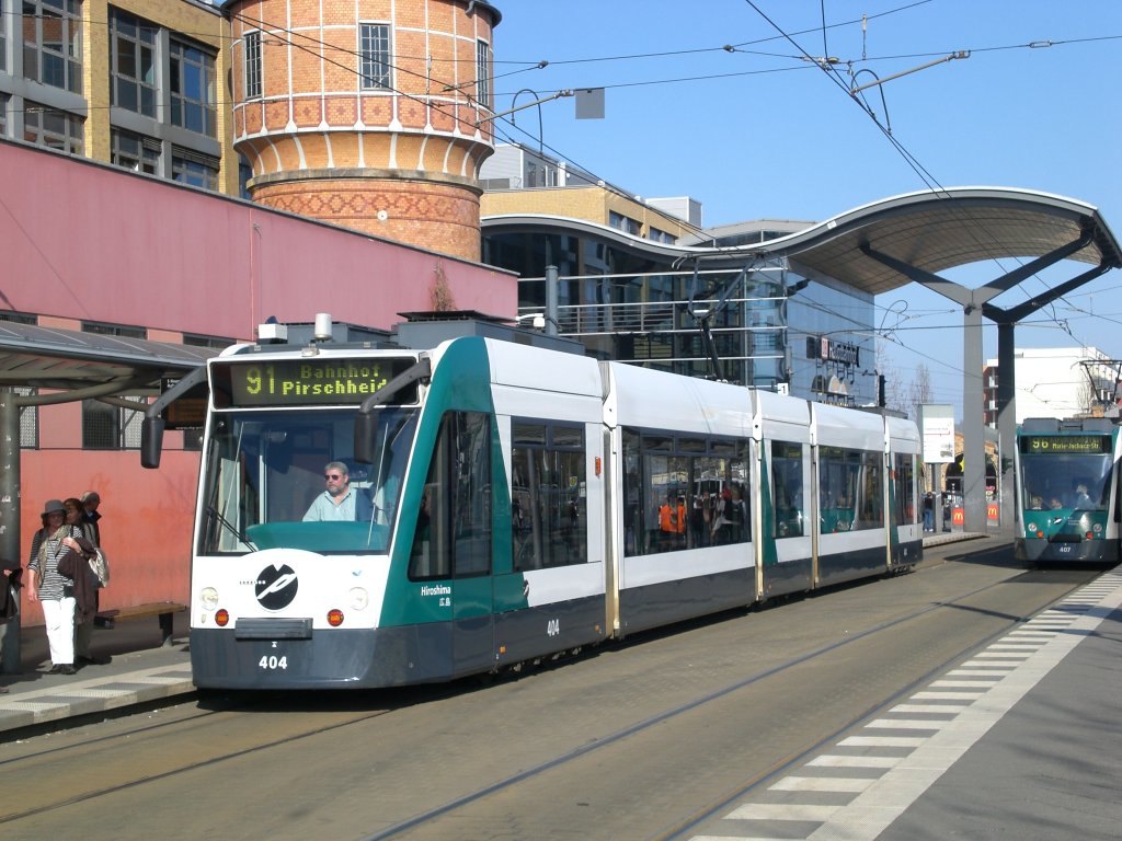 Potsdam: Straßenbahnlinie 91 nach Bahnhof Pirschheide am Hauptbahnhof.(18.4.2010)