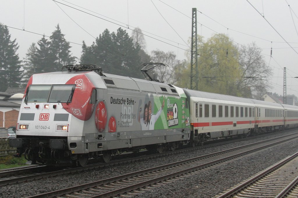 101 102-2 "Wir Menschen sind alle gleich" zieht den IC 2115 von Stralsund nach Stuttgart Hbf durch Düsseldorf-Volksgarten. 24.04.2010