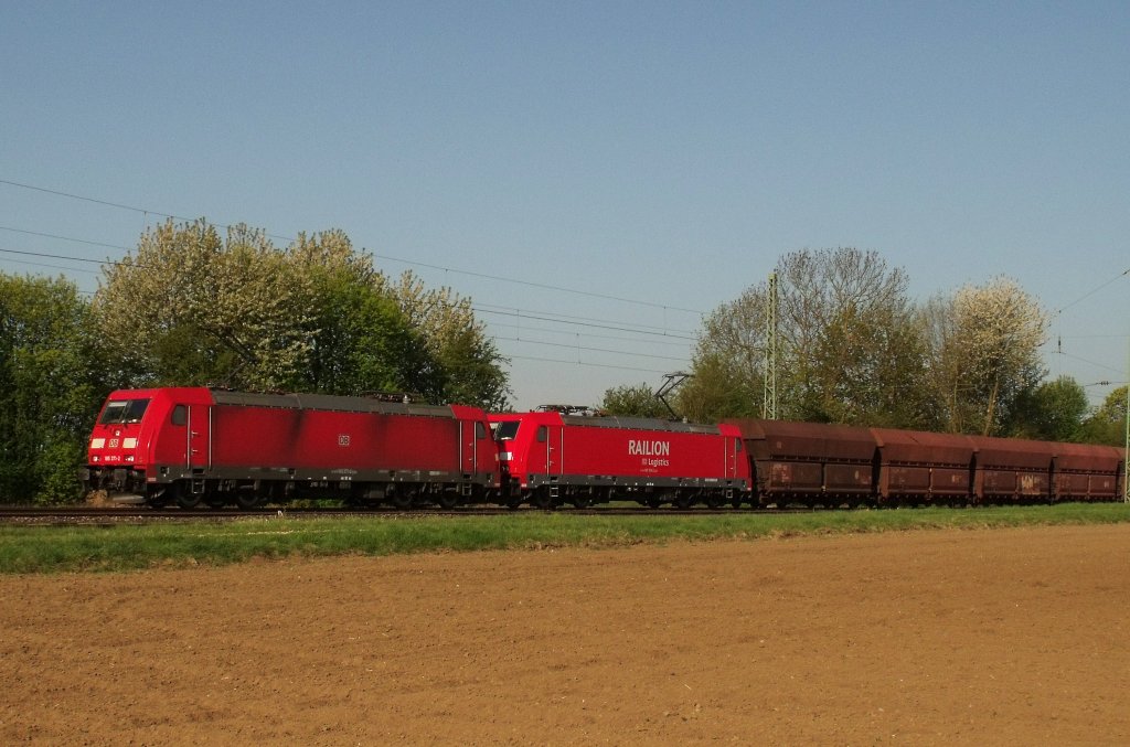 Ein Erzzug mit 2 unbekannt gebliebenen Loks der BR-185 (eine weitere hängt am Zugschluss) bei Edlhausen auf der KBS 880,am 24.04.2010.
