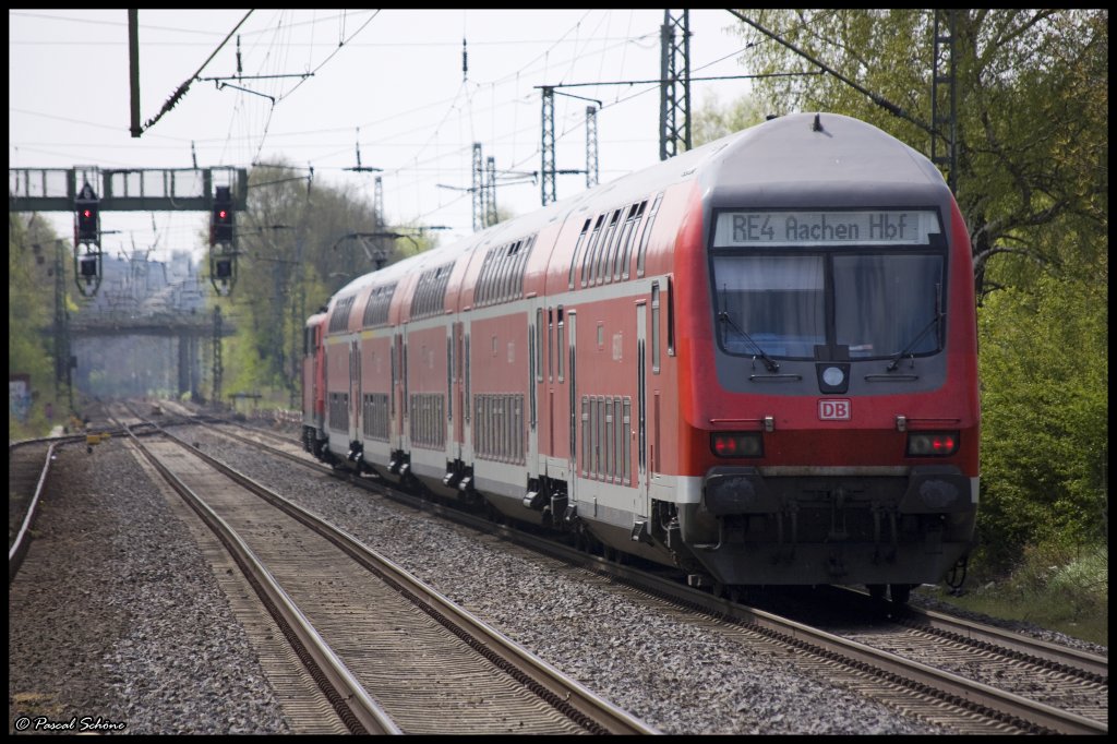 RE4 auf der Fahrt nach Dortmund bei der Einfahrt in den Geilenkirchener Bahnhof. Schublok war die 111 151. 25.04.10 12:34