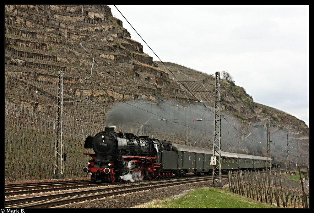 01 1066 mit ihrem Sonderzug von Koblenz kommend in Winningen. Aufgenommen am 03.04.10.