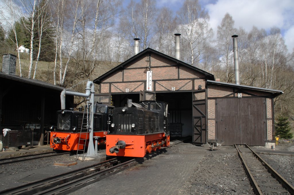 199 009-2 und 199 007-6 sonnen sich am 03.04.10 vor dem Lokschuppen in Jöhstadt.