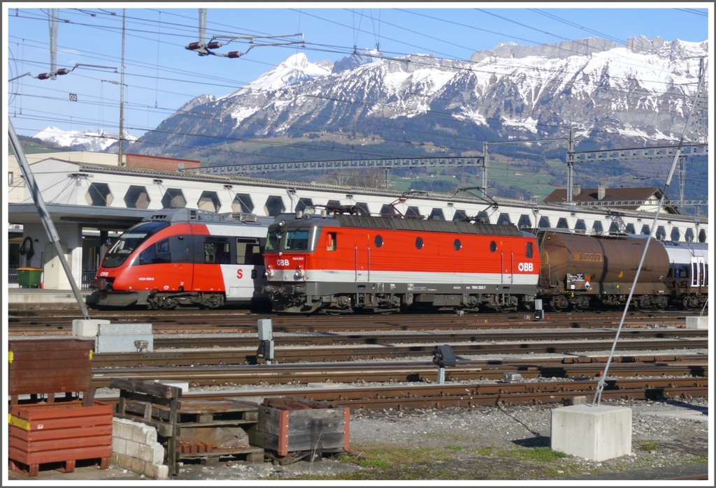 Mir ist wieder mal aufgefallen, wie sauber die österreichischen Triebfahrzeuge daherkommen. Hier treffen sich 4024 098-8 und 1144 203-7 in Buchs SG. (30.03.2010)