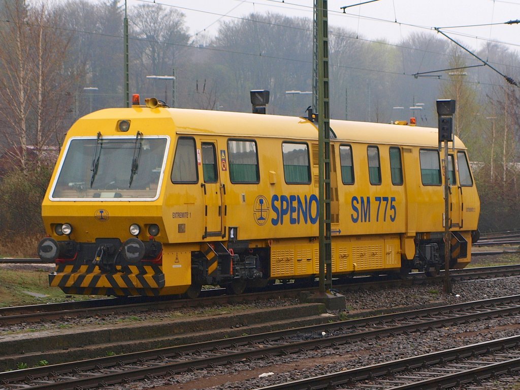 Ein Schienenoberflächen Meßtriebwagen Speno SM 775 steht am 08.04.2010 in Aachen West. Speno International ist ein Schweizer Unternehmen das sich auf Schienenpflege spezialisiert hat. Mit dem SM 775 werden die Schienenprofile mit Ultraschallprüfungen auf innere Schienenfehler (Head Checks) gemessen um genaue Werte vor und nach den Schleifarbeiten zu bekommen.