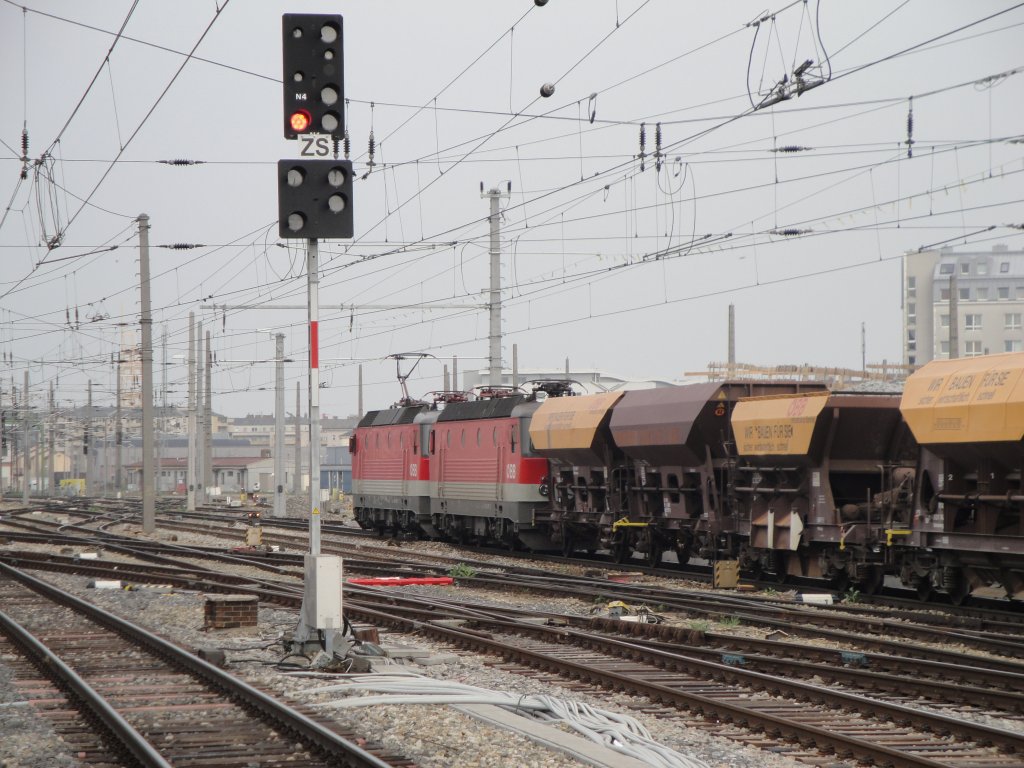 1116 275  Max  mit einem Güterganzzug (LGAG 47010) Richtung Wien. Umleitungsverkehr um 17:35 kurz vor Hausleiten, am 09.04.2010.