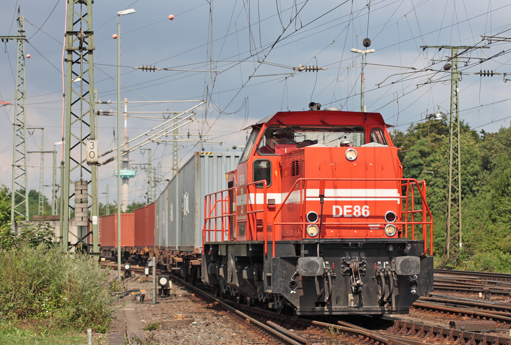 Die DE86 der HGK mit einem Gz bei der Einfahrt in Köln Gremberg, 5.8.10