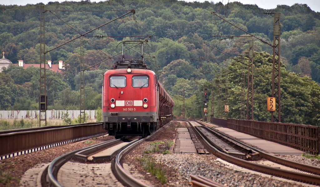 140 569 am 17.08.2010 mit leerem Schotterwagenzug bei der Überquerung der Donau nahe Mariaort.