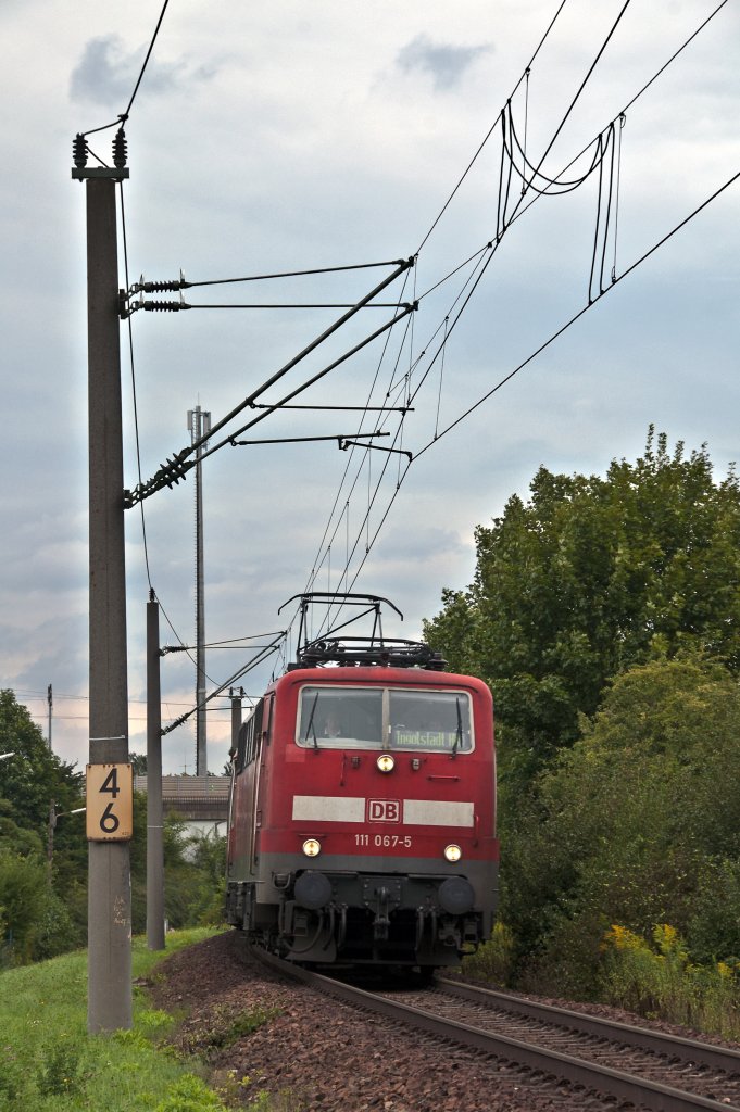 Die schon etwas blass wirkende 111 067 am 17.08.2010 mit RB nach Ingolstadt Hbf kurz nach Regensburg Prüfening.