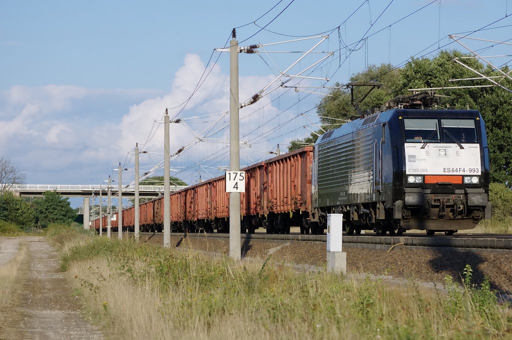 ES 64 F4 - 993 (189 093-8) mit Waggons des Typ´s Eanos-x zwischen Großwudicke und Rathenow in Richtung Stendal. 18.08.2010