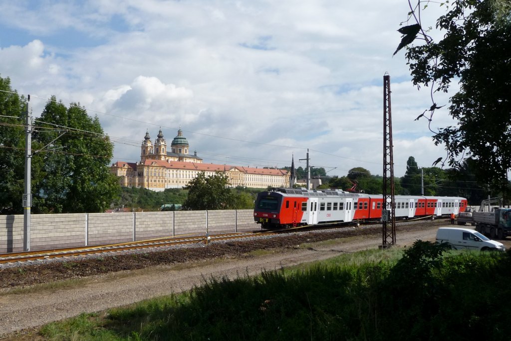 Die alten Stahlmasten sind Geschichte und werden demnächst vollständig entfernt, eine Schallschutzmauer versperrt die freie Sicht auf den Hintergrund. Trotzdem ist mir noch diese Aufnahme mit einer 1144 vor dem Stift Melk gelungen.
